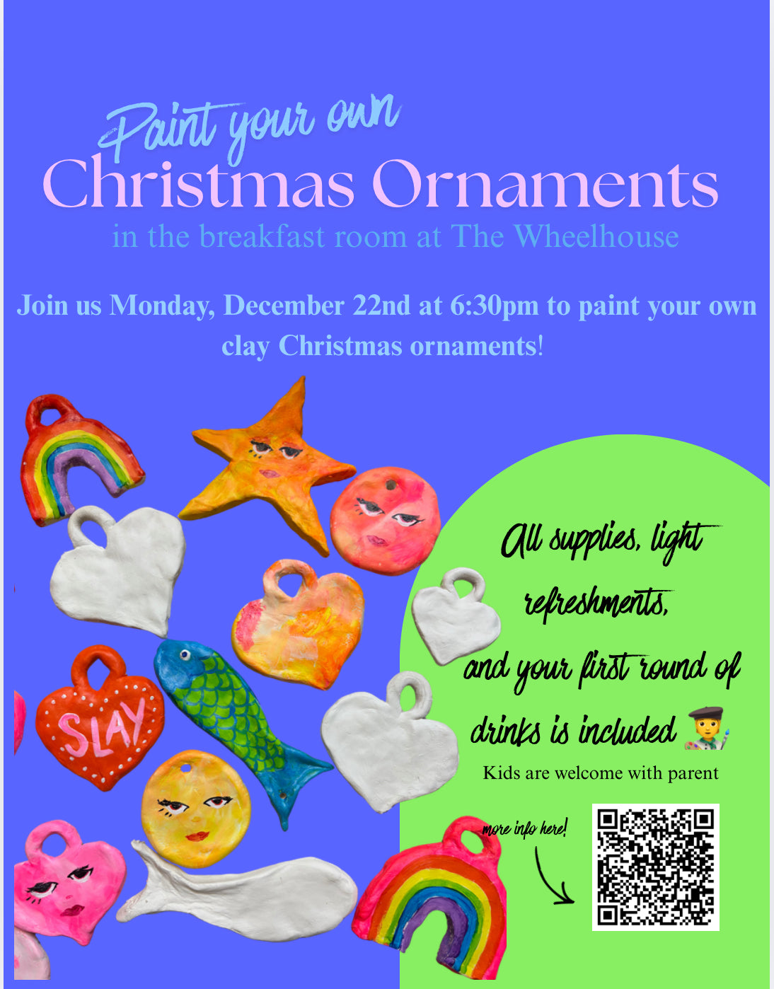 Embracing a crafty Christmas? Join us at The Wheelhouse Monday, December 22nd from 6:30-8:30 to paint your own clay ornaments for your own tree or to give out as gifts!