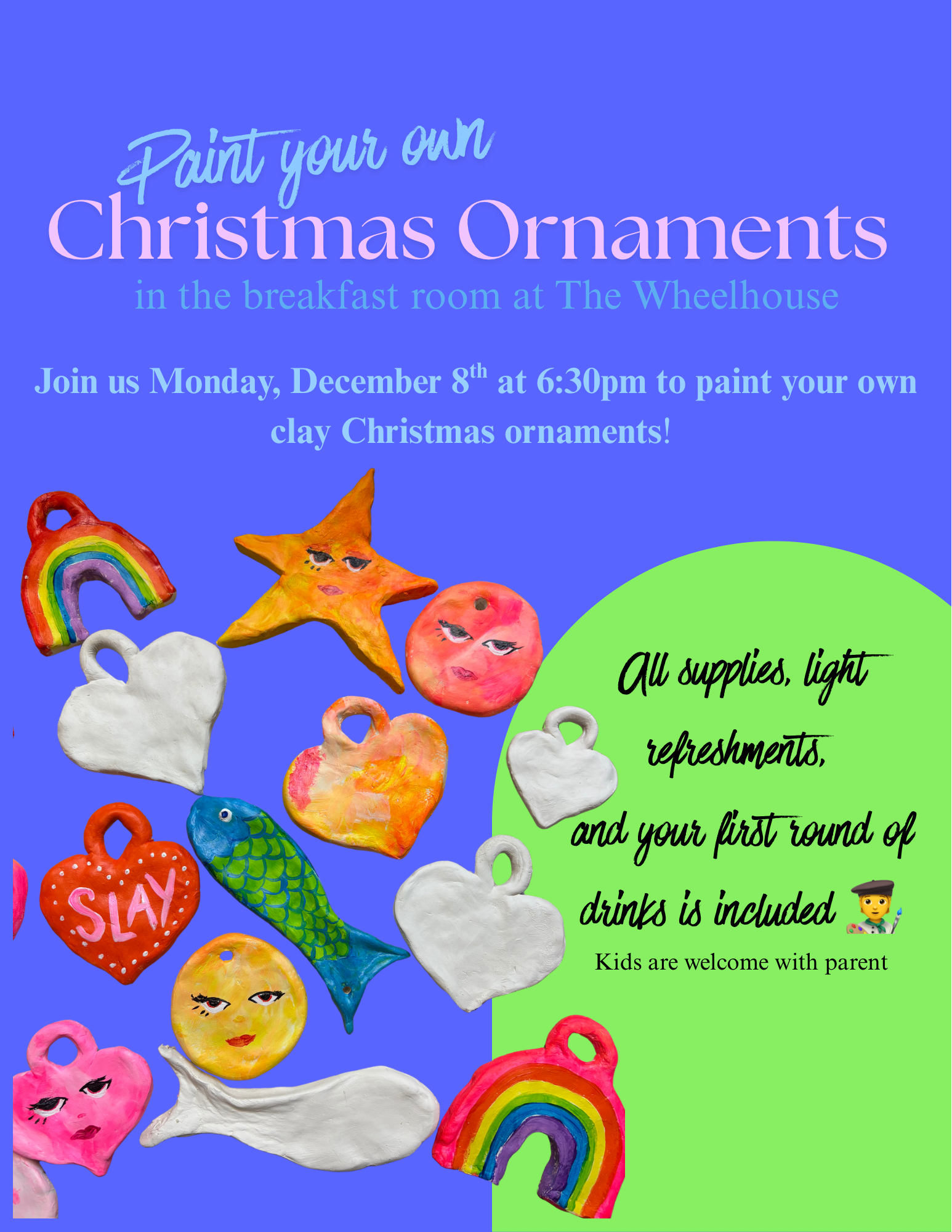 Embracing a crafty Christmas? Join us at The Wheelhouse Monday, December 8th from 6:30-8:30 to paint your own clay ornaments for your own tree or to give out as gifts!